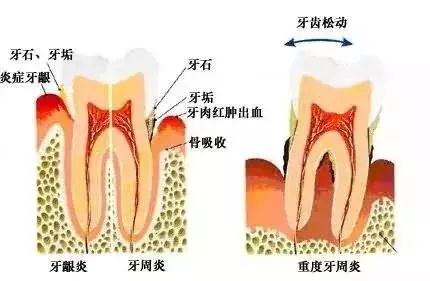 牙周炎是由于长期不良的口腔卫生导致牙结石、牙菌斑在龈缘、牙缝间的堆积,从而持续释放毒素刺激牙龈,造成牙龈红肿、口臭、牙松动等一系列不良后果。
