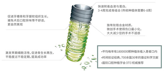 瑞士ITI种植牙是国际牙种植联盟推荐的种植系统,它的理念是“用最简单的方法来取得最好的效果”。 瑞士ITI种植牙系统将与人体生理相容性极高的种植体(人工牙根)种植到牙槽骨内,并与之产生骨结合,具有很强的固位性和稳定性,手术简单,愈合时间短,使用寿命长,更具高效咀嚼功能,外形可与自然牙相媲美,且光泽度比自然牙更胜一筹。具有精准快捷,成功率高。治疗过程微创、痛苦小的优势.